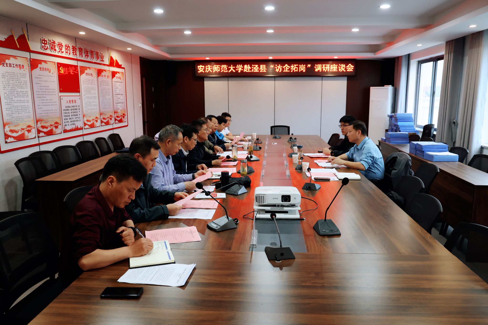 泾县县委教体工委书记、县教体局局长、泾县中学党委书记朱成刚,泾县人社局党组成员、就业服务中心主任朱文凯,泾县教体党工委委员丁传云,泾县教体局人事股负责人汪社会对调研组一行的到来表示热烈欢迎。泾县中学、泾县育才公司、安徽皖南电机股份有限公司、安徽卧龙泵阀股份有限公司、安徽江南泵阀集团有限公司等5家单位介绍了公司及企业发展战略、岗位需求特点,并就校企合作模式、共建实习实训基地等事项进行了交流。