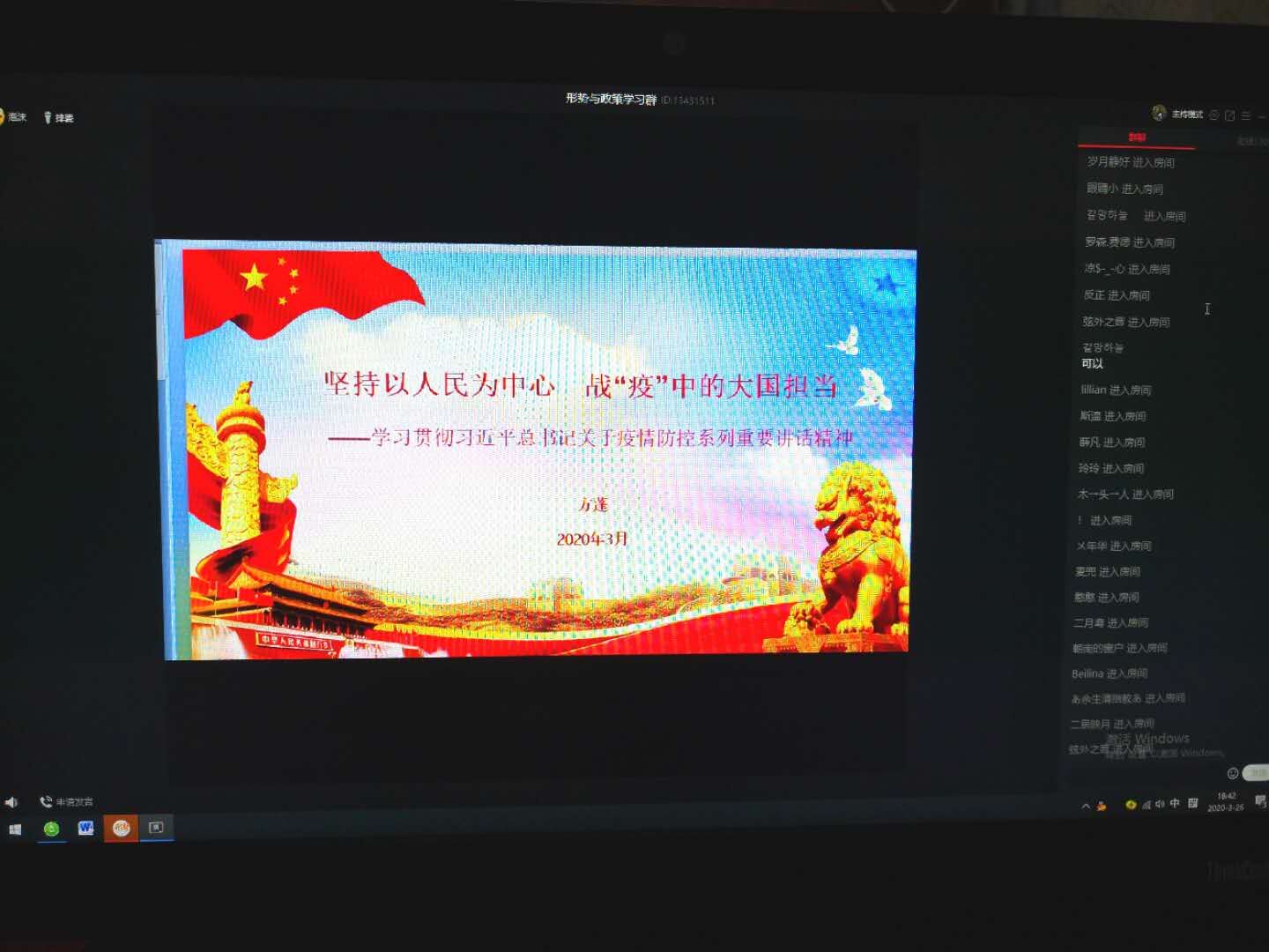3月26日晚上,威廉希尔官网举办第三期公开示范课。方蓬老师以“坚持以人民中心 战‘疫’中的大国担当——学习贯彻习近平总书记关于疫情防控工作的重要讲话精神”为主题,开展线上教学公开示范课。董事长闵永新亲临线上观摩指导,全校近百名教师在线观摩。