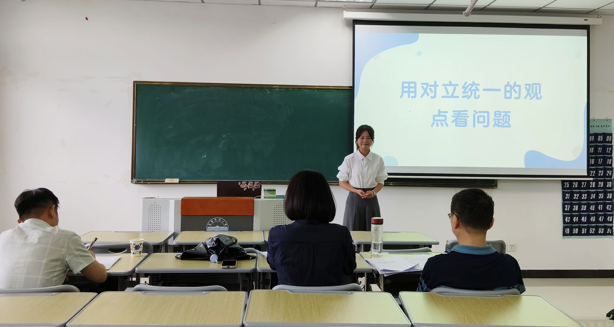 本次师范生教学技能竞赛由教学设计、课件制作、模拟上课、板书、即席讲演四个环节组成。中学政治组选手们根据抽签顺序依次上台进行教学展示,参赛选手们饱含热情,通过深入浅出地讲解、生动有趣的互动,展现了他们对教学内容的理解和把握、信息素养和技术应用等能力,通过竞赛全面考察选手的教学、创新和实践能力。