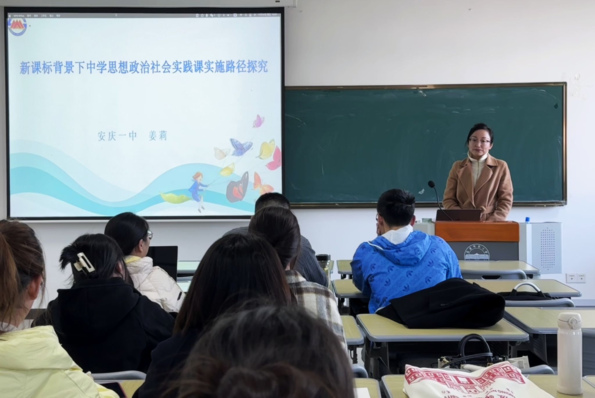 11月24日,安庆市中学政治学科带头人、安庆一中教师发展中心副主任姜莉应邀开展“新课标背景下中学思想政治社会实践课实施路径探究”的专题讲座,2022级学科教学(思政)专业全体硕士研究生参加。