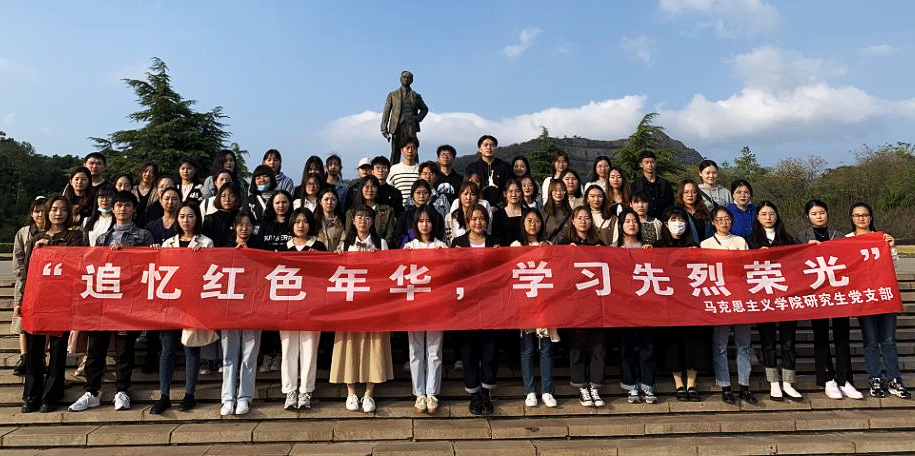 墓园区位于独秀园核心区东部,一条南北向的纪念轴贯穿其中,主要由惊雷浮雕、入口牌坊、柏林墓道、陈独秀雕像、《新青年》碑刻、纪念水池、墓冢等组成。在《新青年》碑刻前,2021级学科思政班的班长边甜甜带领大家一起学习《中国共产党简史》,和大家一起重温中国共产党早期组织的建立及其活动。在陈独秀雕像前,大家集体向雕像鞠躬,向上自己崇高的敬意。2021级马克思主义理论专业高雨晴说道:“作为新时代的新青年,我们要学习陈独秀先生勇于打破旧思想,勇于追求先进思想、坚持民主科学的精神,不断汲取前进力量,成为担当民族复兴大任的时代新人。”