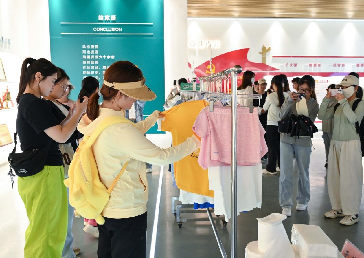 棉纱印染的细腻山水画卷,100%纯棉打造的柔软棉柔巾,纹样精美的色织匹染面料……步入产品展示区,华茂纺织厂以技术创新打造的的特色产品令员工们眼前一亮。“普通棉花经劳动者的巧手,转化为兼具实用功能与美学价值的产品,这正是‘劳动创造无限可能’的生动诠释。”思想政治教育专业2023(2)班的计振康说到。展厅里,两面红旗吸引员工们驻足拍照打卡,这两面国旗正是嫦娥五号和嫦娥六号登月展示的特殊材质的国旗(原样)。“这两面国旗是华茂和武汉纺织大学等单位联合研发的,嫦娥六号登月展示的国旗是中国首次在月球背面独立动态展示的国旗,也是世界首面玄武岩红旗。”听了讲解员的介绍,思想政治教育专业2024(2)班的李震感慨道,原来纺织技术还可以这样应用。