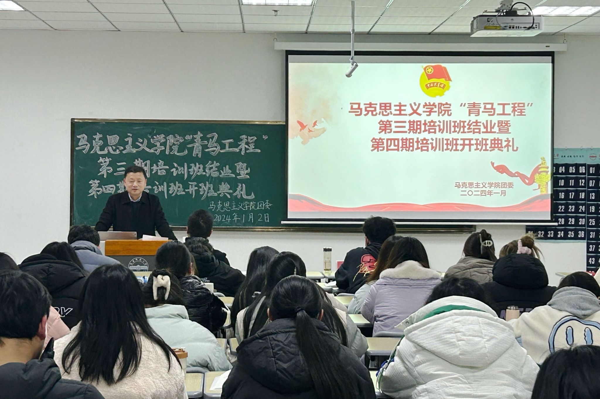 典礼在庄严的国歌声中拉开帷幕。邹斌表达了对全体学员的期望,同时指出开展“青马工程”培训班的重要性。邹斌强调,要提高政治站位,强化思想认识;要突出规范有序,强化培训成效;突出社会实践,强化使命担当。邹斌希望全体学员以“青马工程”培训为契机,传承红色基因,践行知行合一,深入学习领会习近平新时代中国特色社会主义思想,做到学以致用。田梦甜做了第三期青马班的工作总结并宣读了第四期青马班培训要求;思想政治教育专业2022级(1)班王娟、2022级(3)班孙成玲作为第三期和第四期学员代表,在开班典礼上发言。