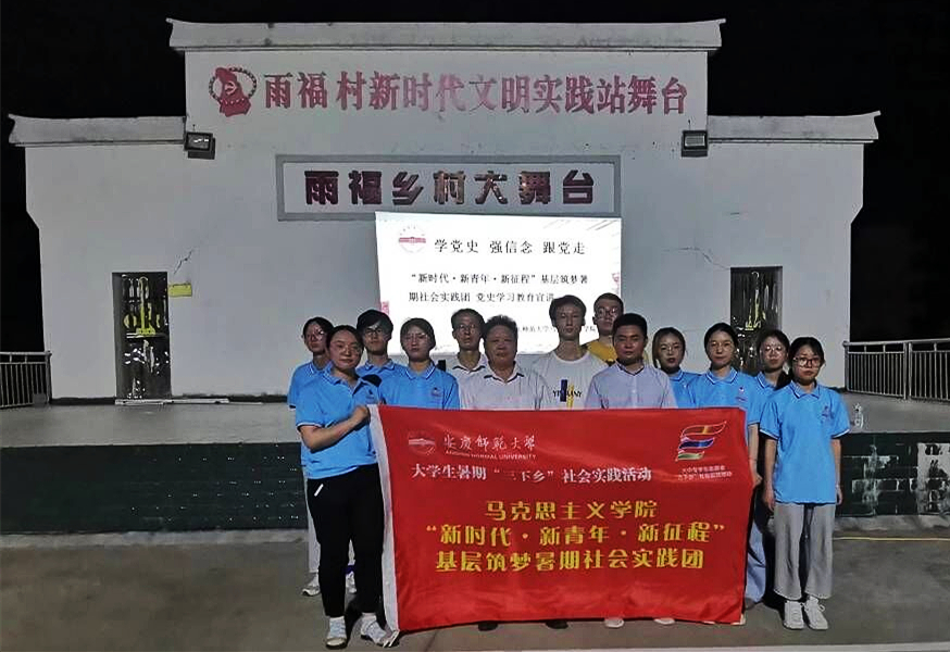 7月12日傍晚,宿松县千岭乡雨福村文化大广场,在村委副书记孙中林的带领下,公司“新时代·新青年·新征程”基层筑梦暑期社会实践团开展党史宣讲活动。