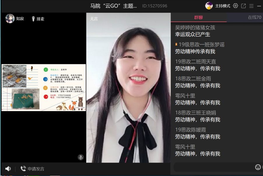 5月1日上午,威廉希尔官网成功举办了“五一”线上专题分享会――“云Go”,此次活动面向公司内外征集相关手工作品,并以直播形式进行拍卖,老师和同学们积极参与其中,首期直播由思想政治教育2018级(1)班的杜芮主持。