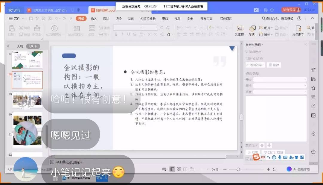 思想政治教育专业2017级(2)班的李静贤从摄影本身、人像拍摄、风景拍摄和后期处理四个模块向大家传递了她关于摄影的认识,她强调色彩整体的协调和景点拍摄的角度,并推荐了自己使用较好的拍摄器材和后期处理软件。前不久,在由团省委、省委网信办、省学联联合开展的2019年度寻访“安徽青年好网民”故事征集评选活动中,李静贤同学获得“青年好网民”称号,获评省级三等奖,她也从新闻角度分享了自己作为老员工网民,如何在网络上积极正确发声,助力构建清朗网络空间的事迹。(贺佳欢 雍雅婷 廖金梅)